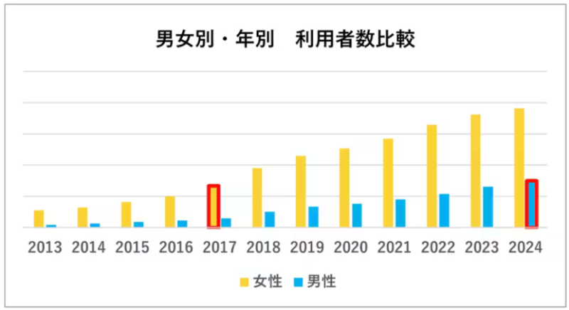 - 20代男性利用者の割合が飛躍的に増加し、2024年には全体の2割を超える